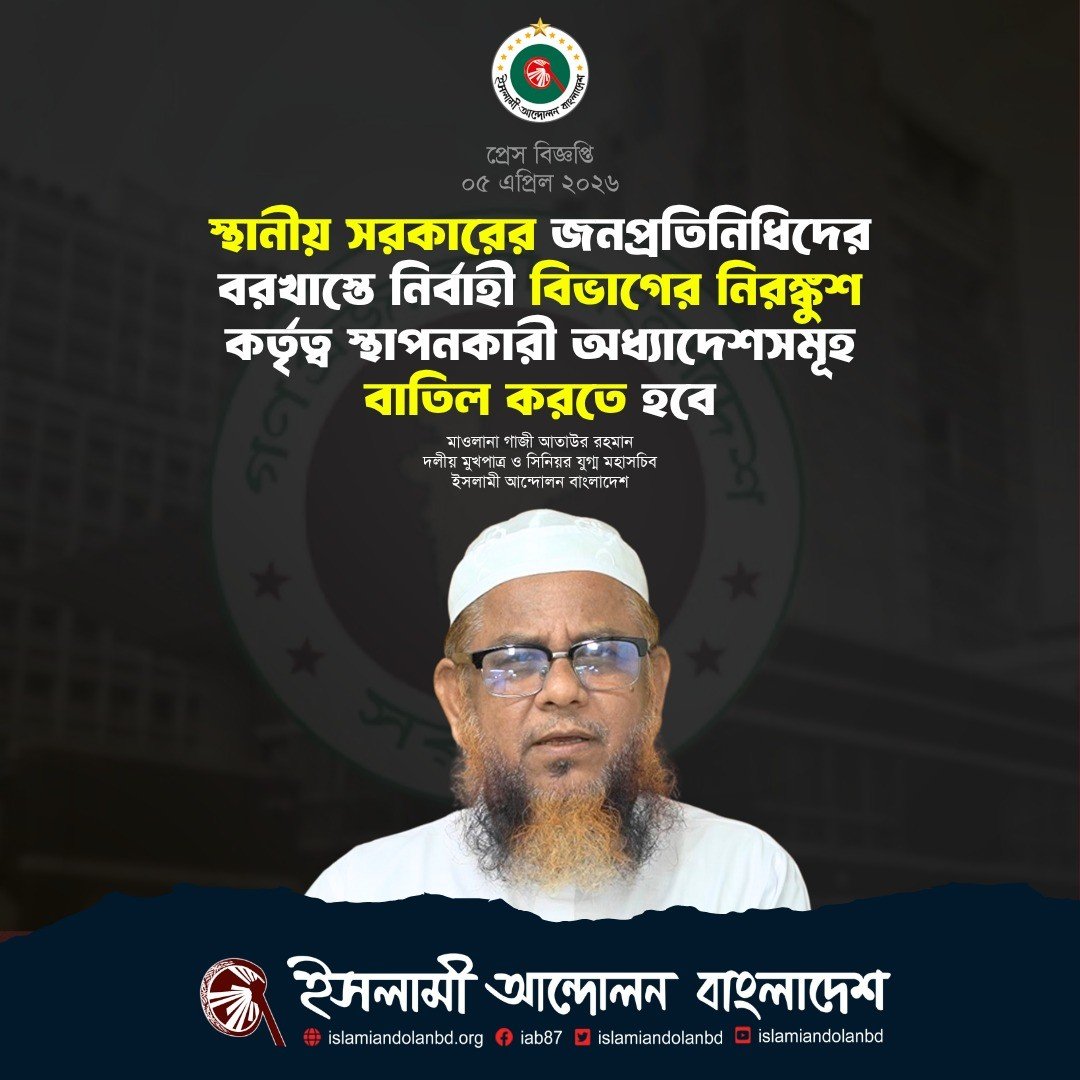 ইসলামী আন্দোলন বাংলাদেশের যুগ্মমহাসচিব ও দলীয় মুখপাত্র মাওলানা গাজী আতাউর রহমান আজ ৫ এপ্রিল এক