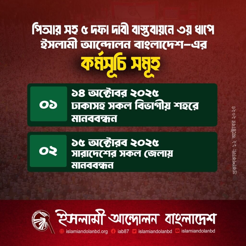 (৫) স্বৈরাচারের দোসর জাতীয় পার্টি ও ১৪ দলের কার্যক্রম নিষিদ্ধ করা।এসব দাবী আদায়ে আগামী ১৪ অক্টোবর ঢাকাসহ দেশের সকল বিভাগীয় শহরে সকাল ১১টা থেকে ১২টা পর্যন্ত মানববন্ধন এবং ১৫ অক্টোবর সারাদেশের সকল জেলায় সকাল ১১টা থেকে ১২টা মানববন্ধন অনুষ্ঠিত হবে। কেন্দ্রীয়, বিভাগীয় ও জেলা নেতৃবৃন্দসহ সারা দেশের সর্বস্তরের মানুষ মানববন্ধনে অংশ নেবে।