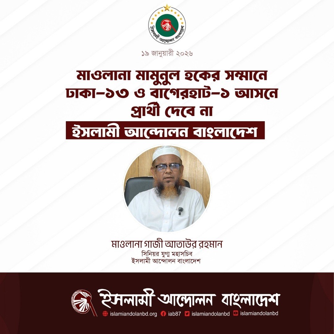 ইসলামী আন্দোলন বাংলাদেশের যুগ্ম মহাসচিব ও দলীয় মুখপাত্র মাওলানা গাজী আতাউর রহমান আজ এক বিবৃতিতে