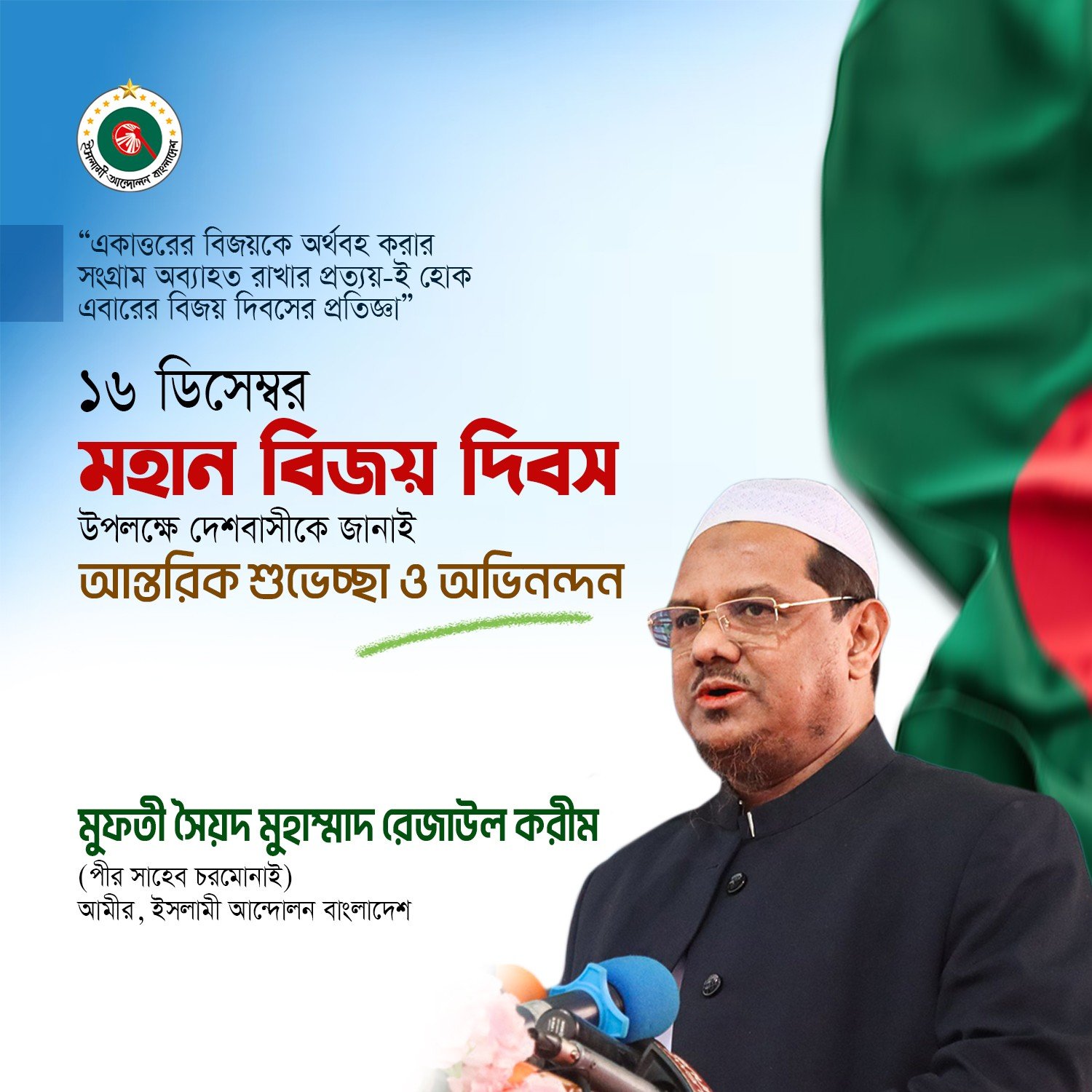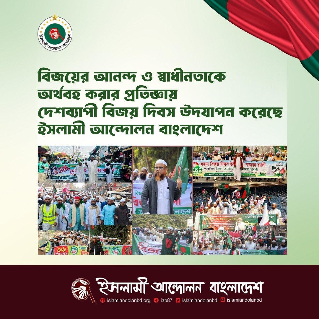 “একাত্তরের অর্জিত স্বাধীনতাকে অর্থবহ করার প্রতিজ্ঞা” উপপাদ্যকে সামনে রেখে বিজয়ের আনন্দ ও স্বাধীনতাকে অর্থবহ করার প্রতিজ্ঞায় দেশব্যাপী ৫৫ তম বিজয় দিবস উদযাপন করেছে ইসলামী আন্দোলন