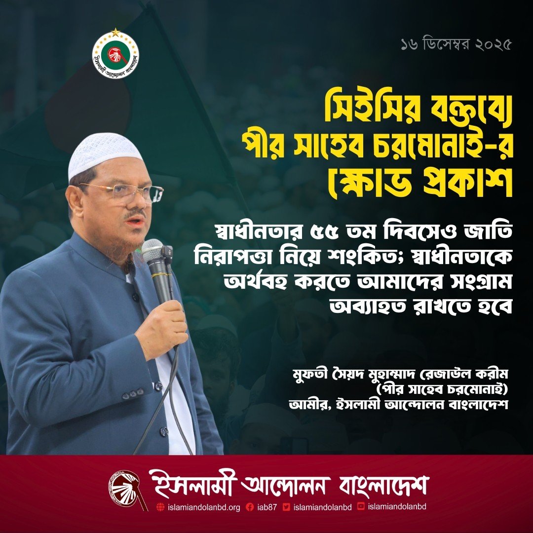 স্বাধীনতার ৫৫ তম দিবসেও জাতি নিরাপত্তা নিয়ে শংকিত; স্বাধীনতাকে অর্থবহ করতে আমাদের সংগ্রাম অব্যাহত রাখতে হবে -পীর সাহেব চরমোনাই ইসলামী আন্দোলন বাংলাদেশের আমীর মুফতি সৈয়দ