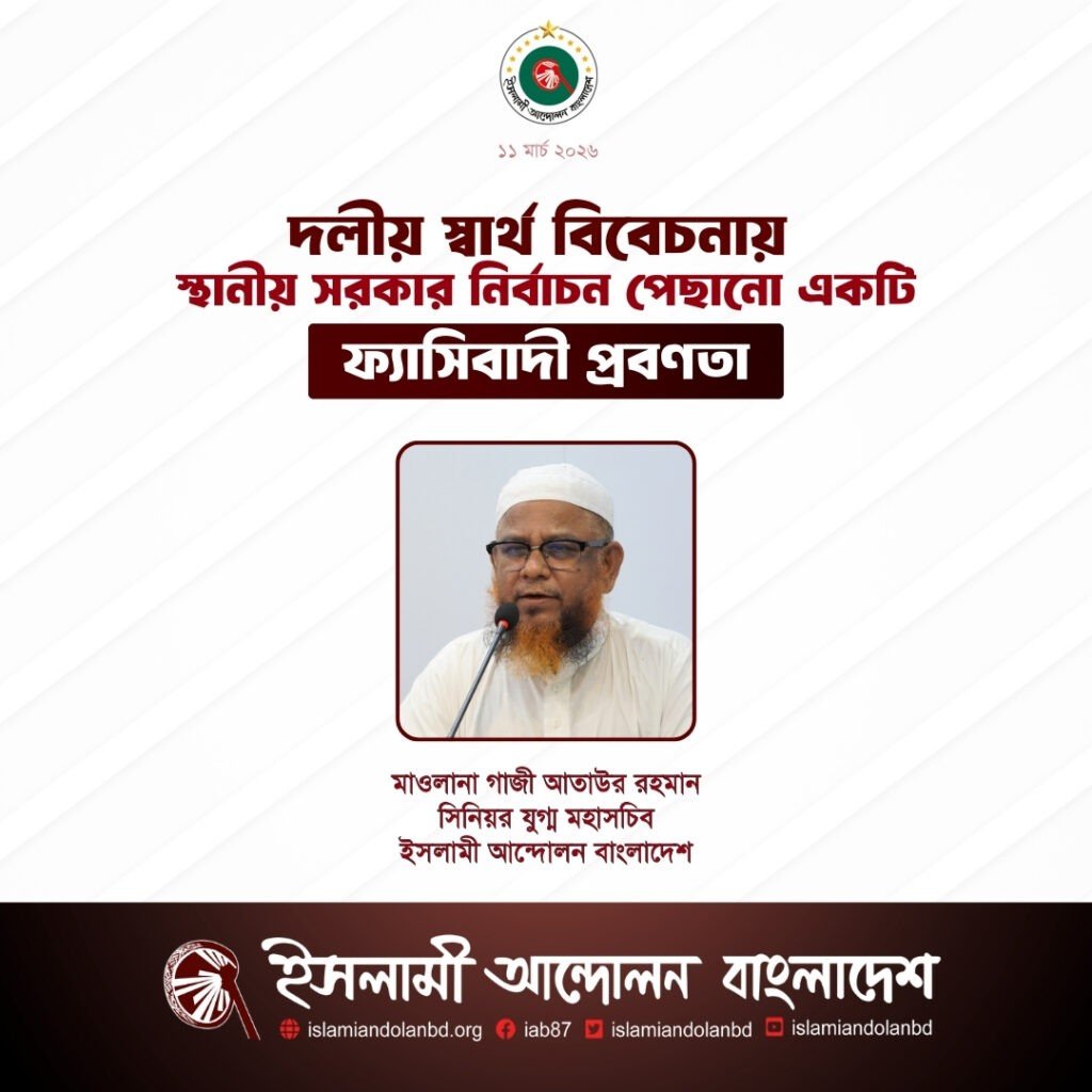 ইসলামী আন্দোলন বাংলাদেশের যুগ্মমহাসচিব ও দলীয় মুখপাত্র মাওলানা গাজী আতাউর রহমান বলেছেন, স্থানীয় বা জাতীয়; সকল নির্বাচন নিজস্ব নিয়মে সময়মাফিক সুষ্ঠুভাবে অনুষ্ঠিত হওয়াই গণতান্ত্রিক রীতি ও সৌন্দর্য্য। ভোট নিয়ে কারসাজির বিরুদ্ধে দীর্ঘ আন্দোলন ও জুলাই গণঅভ্যুত্থানের পরে আমাদের সকলের প্রত্যাশা ছিলো, দেশে আর যাই হোক নির্বাচন সময়মত নিজস্ব আইন মোতাবেক সুষ্ঠুভাবে আয়োজিত হবে। এখানে ক্ষমতাসীন সরকার কোনভাবে হস্তক্ষেপ করবে না। কিন্তু অতিব দুঃখের সাথে দেখছি যে, সরকার ক্ষমতাসীন দলের দলীয় প্রস্তুতি না থাকার কারণে স্থানীয় সরকার নির্বাচন যথাসময়ে আয়োজন করতে অনিহা দেখাচ্ছে এবং সর্বত্র দলীয় লোকজনকে প্রশাসক হিসেবে নিয়োগ দেয়ার পাঁয়তারা করছে। ফ্যাসিবাদও নির্বাচনে নিজ দলের বিজয় নিশ্চিত করার জন্য নানারকম ছলচাতুরী করতো। দলীয় স্বার্থ বিবেচনায় নির্বাচনের সময় পেছানো নিঃসন্দেহে একটি ফ্যাসিবাদী প্রবণতা। বিএনপির কাছে মানুষ একই রকম অপকৌশল আশা করে না। ইসলামী আন্দোলন বাংলাদেশ স্থানীয় সরকার নির্বাচন যথাসময়ে আয়োজন করার দাবী জানাচ্ছে।
