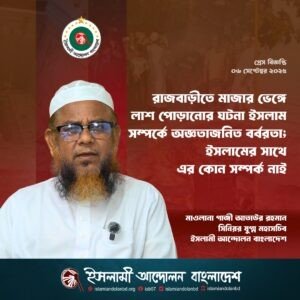 রাজবাড়ীতে মাজার ভেঙ্গে লাশ পোড়ানোর ঘটনা ইসলাম সম্পর্কে অজ্ঞতাজনিত বর্বরতা; ইসলামের সাথে এর কোন সম্পর্ক নাই September 6, 2025 বিস্তারিত পড়ুন »