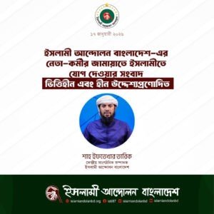 ইসলামী আন্দোলন বাংলাদেশের নেতা-কর্মীর জামায়াতে ইসলামীতে যোগ দেওয়ার সংবাদ ভিত্তিহীন এবং হীন উদ্দেশ্যপ্রণোদিত January 17, 2026 বিস্তারিত পড়ুন »