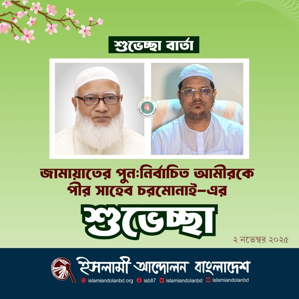 ইসলামী আন্দোলন বাংলাদেশের আমীর মুফতি সৈয়দ মুহাম্মাদ রেজাউল করীম, পীর সাহেব চরমোনাই বাংলাদেশ জামায়াতে ইসলামীর পুন: নির্বাচিত আমীর ডাক্তার শফিকুর রহমানকে মোবারকবাদ ও শুভেচ্ছা জানিয়েছেন।
