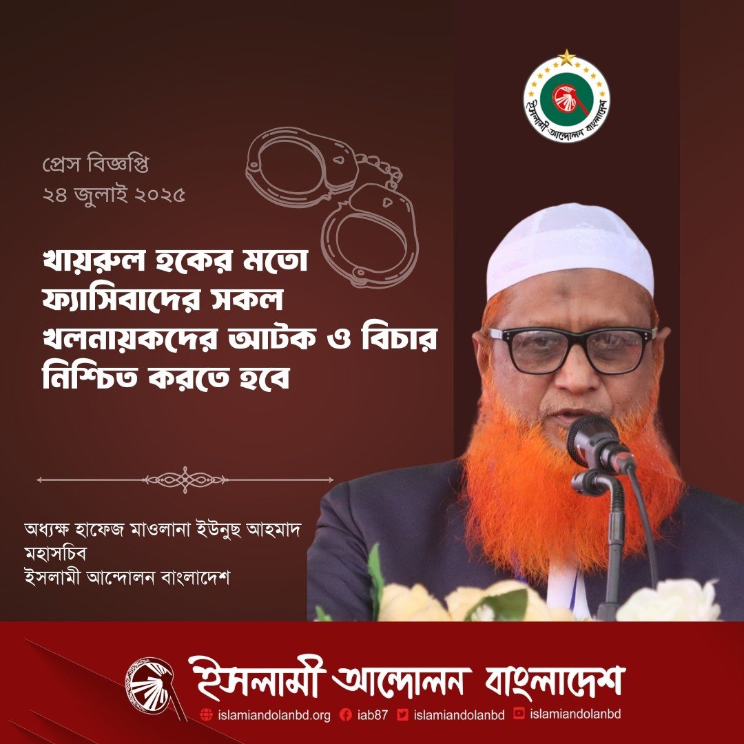 ইসলামী আন্দোলন বাংলাদেশের মহাসচিব ও অধ্যক্ষ মাওলানা ইউনুস আহমদ আজ ২৪ জুলাই এক বিবৃতিতে বলেছেন, বাংলাদেশে ফ্যাসিবাদ তৈরি হয়েছে আইন, সংবিধান ও আদালত ব্যবহার করে। আর সেই যাত্রায় যারা আওয়ামী লীগকে নগ্নভাবে সহায়তা করেছেন তাদের অন্যতম ছিলো এই খাইরুল হক। খায়রুল হককে অবশেষে গ্রেফতার করায় সরকারকে ধন্যবাদ; একই সাথে খায়রুল হকের মতো কালপ্রিটকে এতোদিন মুক্তভাবে থাকতে দেয়ার জন্য সরকারকে দায়বদ্ধ করছি।