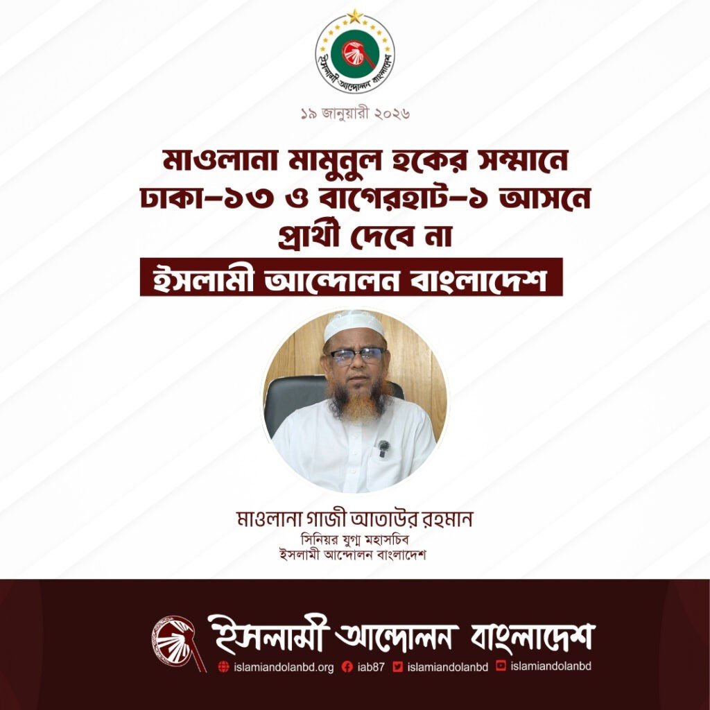 ইসলামী আন্দোলন বাংলাদেশের যুগ্ম মহাসচিব ও দলীয় মুখপাত্র মাওলানা গাজী আতাউর রহমান আজ এক বিবৃতিতে জানিয়েছেন, খেলাফত মজলিসের আমীর মাওলানা মামুনুল হকের প্রতি সম্মান জানিয়ে তিনি যে দুই আসনে প্রার্থী হয়েছেন সেই দুই আসনে ইসলামী আন্দোলন বাংলাদেশ প্রার্থী দেবে না। এই দুই আসনে ইসলামী আন্দোলন বাংলাদেশের প্রার্থী প্রত্যাহার করা হবে। দুই আসনেই ইসলামী আন্দোলন এর সমর্থন মাওলানা মামুনুল হকের প্রতি থাকবে। ইসলামী রাজনীতিতে তাঁর ত্যাগ ও অবদানের প্রতি সম্মান জানিয়ে এই সিদ্ধান্ত নেয়া হয়।