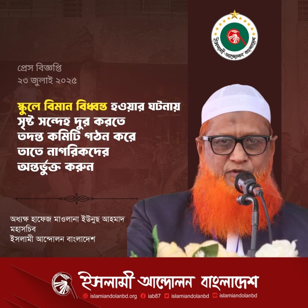 ইসলামী আন্দোলন বাংলাদেশের মহাসচিব অধ্যক্ষ মাওলানা ইউনুস আহমাদ আজ ২৩ জুলাই এক বিবৃতিতে বলেছেন, ২১ তারিখ উত্তরার মাইলস্টোন স্কুলে বিমান বাহিনীর বিমান বিধ্বস্ত হওয়ার ঘটনায় নানা রকম অবিশ্বাস ও সন্দেহ তৈরি হয়েছে বা তৈরি করা হয়েছে। এটা আমাদের জন্য দুর্ভাগ্য যে, পতিত ফ্যাসিবাদ বিভিন্ন ঘটনায় এতো বেশি মিথ্যা বলতো যে, মানুষ এখন সরকারী প্রতিষ্ঠানের তথ্যকে আর বিশ্বাস করে না। রাষ্ট্র ও সরকারের প্রতি নাগরিকদের এমন গণ-অবিশ্বাস আমাদের আগামীর পথচলার ক্ষেত্রে বড় ধরণের হুমকি। জোড় করে মানুষের বিশ্বাস-অবিশ্বাস ভাঙ্গা যায় না। তাই তদন্ত কমিটিতে নাগরিকদের অন্তর্ভুক্ত করে বস্তুনিষ্ঠ তথ্য সামনে নিয়ে আসতে হবে।