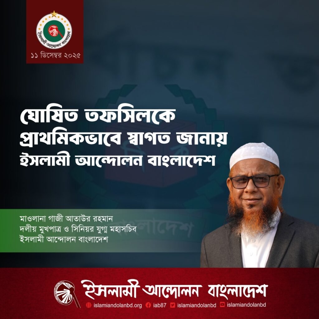 ইসলামী আন্দোলন বাংলাদেশ-এর সিনিয়র যুগ্ম মহাসচিব ও দলীয় মুখপাত্র মাওলানা গাজী আতাউর রহমান আজ ১১ ডিসেম্বর, সন্ধ্যায় ঘোষিত ত্রায়োদশ জাতীয় সংসদ নির্বাচনের তফসিলকে তৎক্ষনাৎ প্রতিক্রিয়ায় স্বাগত জানিয়ে এক ভিডিও বার্তায় বলেছেন, জনগণের প্রত্যাশামাফিক ফেব্রুয়ারিতে নির্বাচন আয়োজনের যে তফসিল ঘোষিত হয়েছে তাকে ইসলামী আন্দোলন বাংলাদেশ প্রাথমিকভাবে স্বাগত জানায়।