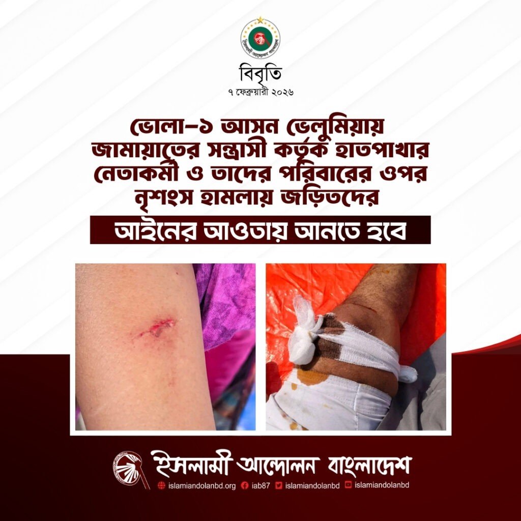 ইসলামী আন্দোলন বাংলাদেশের প্রেসিডিয়াম সদস্য ও নির্বাচন পরিচালনা কমিটির আহবায়ক অধ্যাপক মাহবুবুর রহমান আজ ৭ ফেব্রুয়ারি, শনিবার এক বিবৃতিতে বলেছেন, ভোলা-১ আসনে বাংলাদেশ জামায়াতে ইসলামীর কর্মীদের ঔদ্ধত্য ধৈর্যের সীমা ছাড়িয়ে যাচ্ছে। নির্বাচনী পরিবেশকে উত্তপ্ত করে তুলছে। আজকেও আমাদের কর্মীদের ওপরে যে হামলার ঘটনা ঘটেছে ইসলামী আন্দোলন বাংলাদেশ তার তীব্র নিন্দা জানাচ্ছে এবং প্রশাসনের প্রতি আহবান করছে যেন, অবিলম্বে অপরাধীদের আইনের আওতায় আনা হয়। কারণ এই ধরণের সন্ত্রাসী কর্মকাণ্ড উৎসবমূখর নির্বাচনের পরিবেশকে কলুষিত করবে।